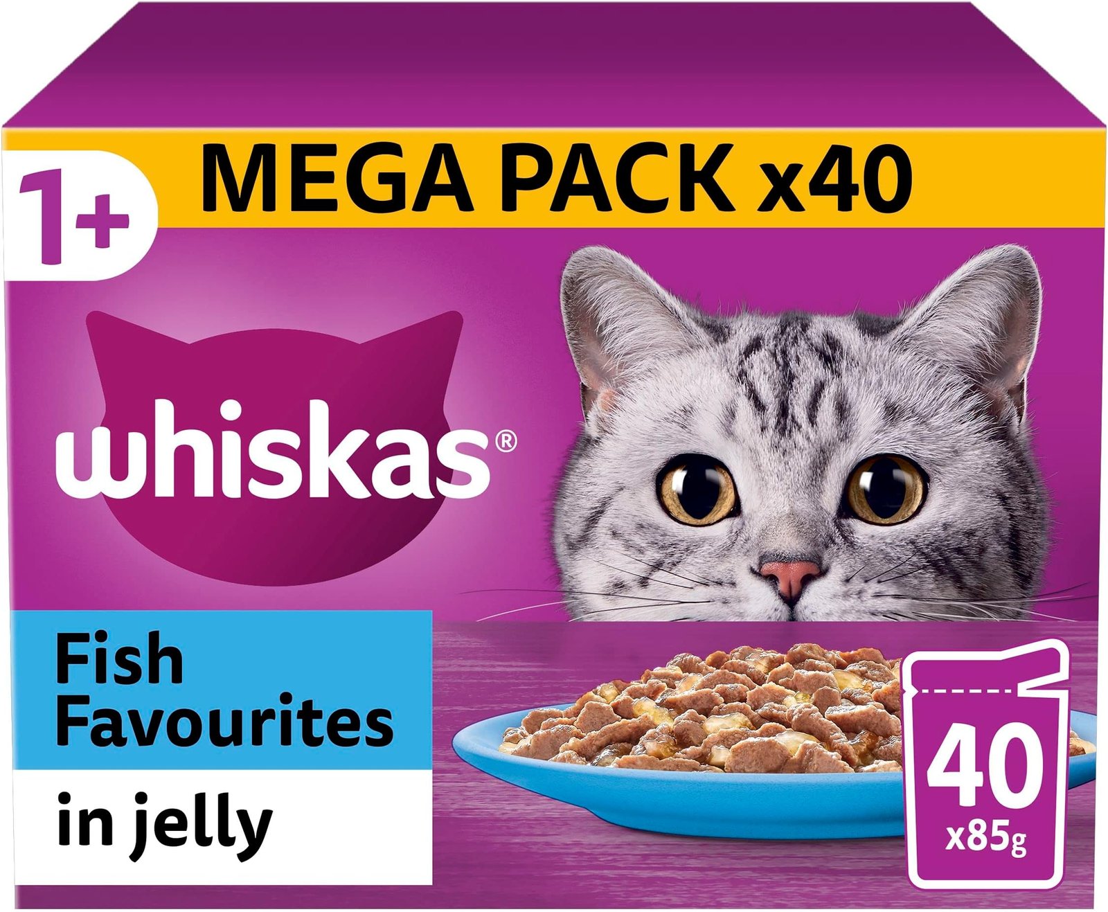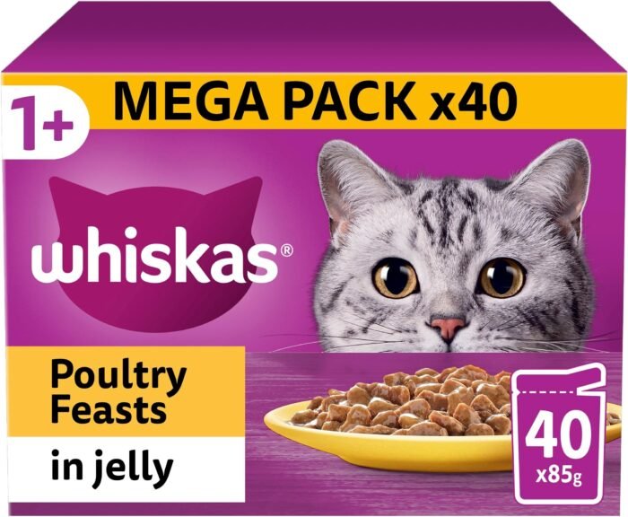 Whiskas 1+ Pouch Mega Pack offers a delicious variety of Fish and Meaty Selection in Jelly, perfect for adult cats. With 40 pouches of 100g each, this wet cat food provides a balanced and flavorful meal for your feline friend. Cats will enjoy the combination of fish and meat in a jelly texture, ensuring they get vital nutrients and stay satisfied. A convenient and affordable choice for cat owners looking to provide their pets with high-quality food.